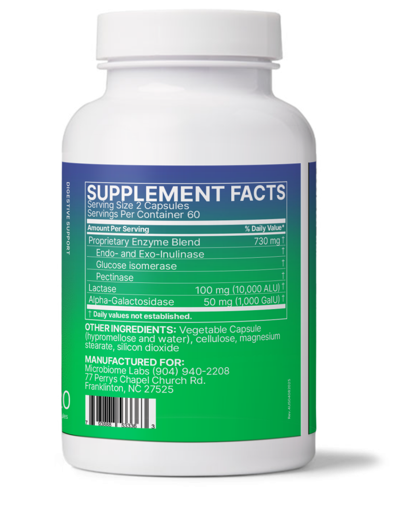 Mengde per porsjon: 2 kapsler: Laktase (10 000 ALU), Alfa-galaktosidase (1 000 GaIU) og en enzymblanding på 730 mg med endo- og eksotype inulinase, glukose-isomerase og pektinase.
